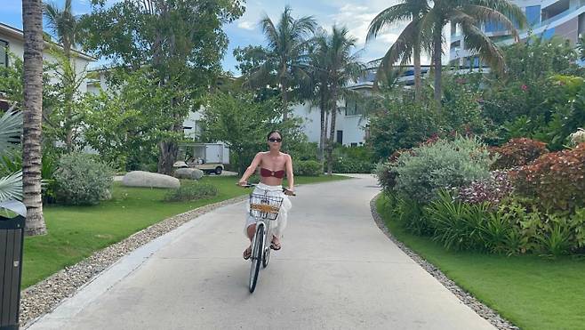 공개된 사진 속 오윤아는 브라운 비키니 톱과 화이트 스커트, 블랙 선글라스를 매치한 패션으로 베트남 나트랑에서 여유로운 일상을 보내고 있는 모습.