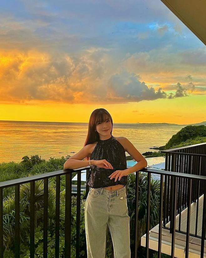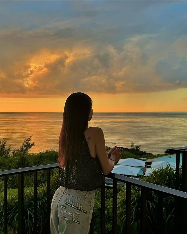 또 다른 사진에서는 아름다운 노을을 배경으로 '직각 어깨' 라인을 드러냈다.