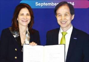 이 총장은 “글로벌 기술 패권 시대에 AI는 국가 경쟁력 확보에 필수 요소”라고 강조했다. 린다 밀스 뉴욕대 총장(왼쪽)은 “AI는 기후 변화, 헬스케어 등 여러 사회적 문제를 해결하는 데 큰 역할을 할 것”이라고 말했다.