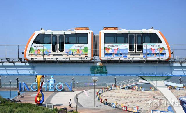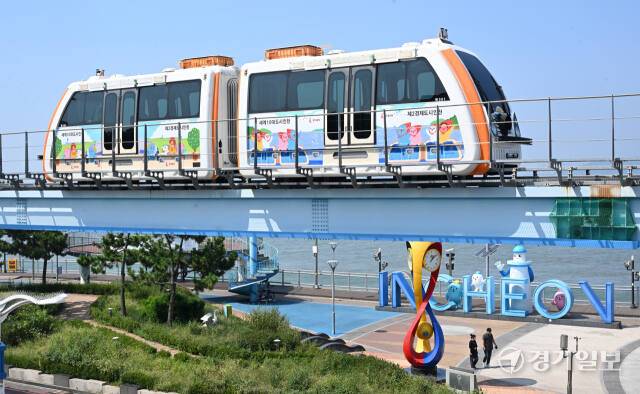 9일 인천 중구 월미도에서 인천교통공사가 운영하는 월미바다열차가 외관에 '세계 10대 도시 인천, 제2 경제도시 인천' 도약을 위한 스티커를 부착하고 홍보 운행을 하고 있다.