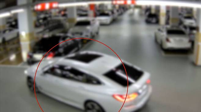 결국, 상가 지하 주차장에 들어가 또 다른 차량을 물색합니다.