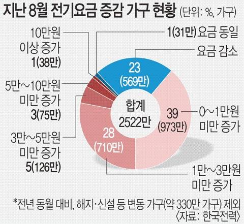 다만 한전은 전기요금 증가가 우려했던 수준보다는 낮았다고 설명했다. 한전 관계자는 “오히려 전기요금이 줄어든 가구도 23%나 됐다”며 “냉방 수요 증가에도 국민의 자발적 전기 절약으로 전기요금 증가가 제한적 수준이었다”고 말했다.