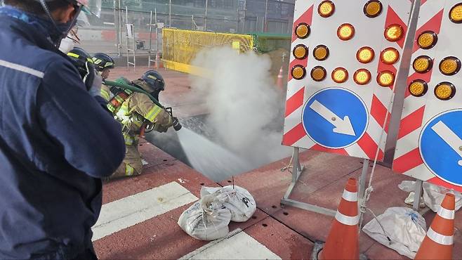 (시흥=뉴스1) 김기현 기자 = 10일 오전 5시께 경기 시흥시 목감동 신안산선 목감역 지하 공사 현장에서 화재가 발생해 소방 당국이 진화 작업을 벌이고 있다. (경기도소방재난본부 제공) 2024.9.10/뉴스1