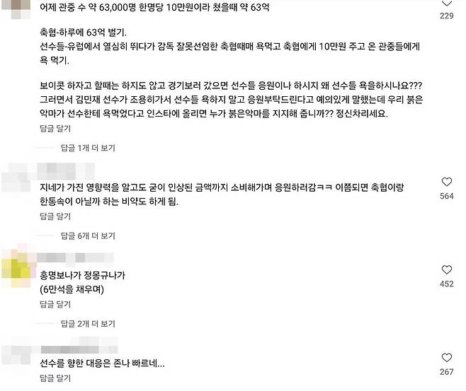 어느 팬은 "저 날 관중 수가 6만 3,000명인데 표 한장에 10만원이라고 쳐도 63억"이라며 "축구협회는 하루에 63억을 벌었고 선수들은 10만원 주고 온 관중들에게 욕먹었다. 보이콧 하자고 할땐 조용하더니 경기 보러 가서는 응원이나 하지 왜 선수 욕을 하느냐"고 질타의 목소리를 높이기도 했다.