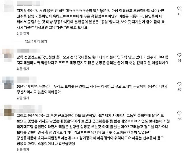 그러나 붉은 악마 역시 축구팬들의 비난을 피해갈 수는 없었다. 경기 종료 후 붉은 악마의 입장문에 모여든 팬들은 "티켓값은 꾸역꾸역 다 주고 협회 배불려주면서 야유를 도대체 왜 하러 가느냐" "이런 식의 항의는 해외에서 온 선수들에게도 예의가 아니다" "(홍명보 감독 선임) 사건 한창 벌어질 땐 입 꾹 닫더니 김민재 저격할땐 얼른 입장문을 올리느냐"고 날카로운 비판을 내놓았다.