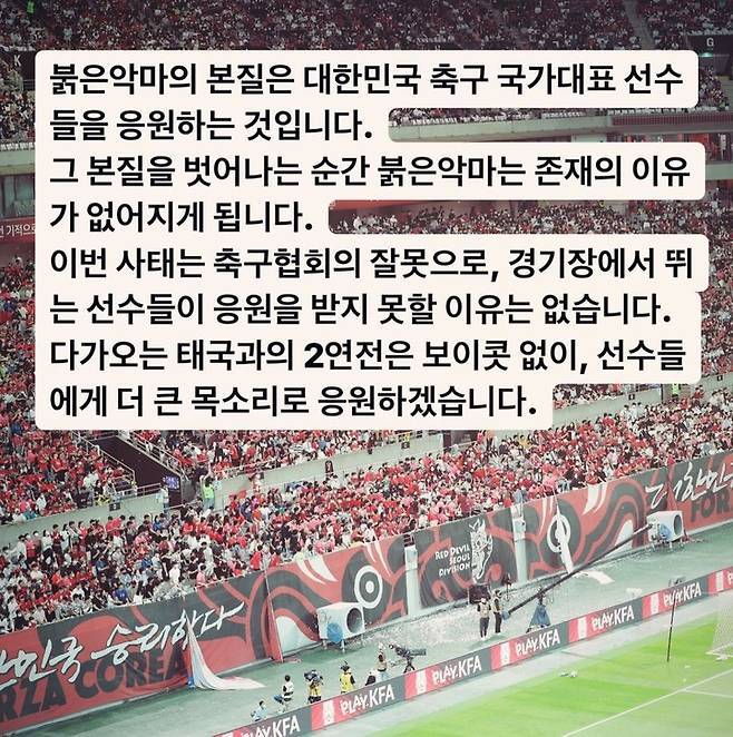 이어 "지난 몇 달 간 공정과 상식이 없는 불통의 대한축구협회의 행위에 붉은 악마는 목소리를 가장 잘 낼 수 있고 주목해 줄 수 있는 곳, 그리고 붉은 악마의 본질과 존재의 이유인 선수들은 응원해야한다는 생각으로 경기장 N석 골대 뒤에서 90분 간 선수들과 함께 뛰고 울고 웃었다. 붉은 악마가 탄생한 순간부터 지금까지 선수들과 모든 순간을 함께 했고, '못하길 바라고', '지기를 바라고' 응원을 하지 않았다"라고 덧붙였다.