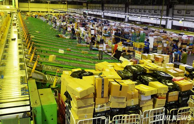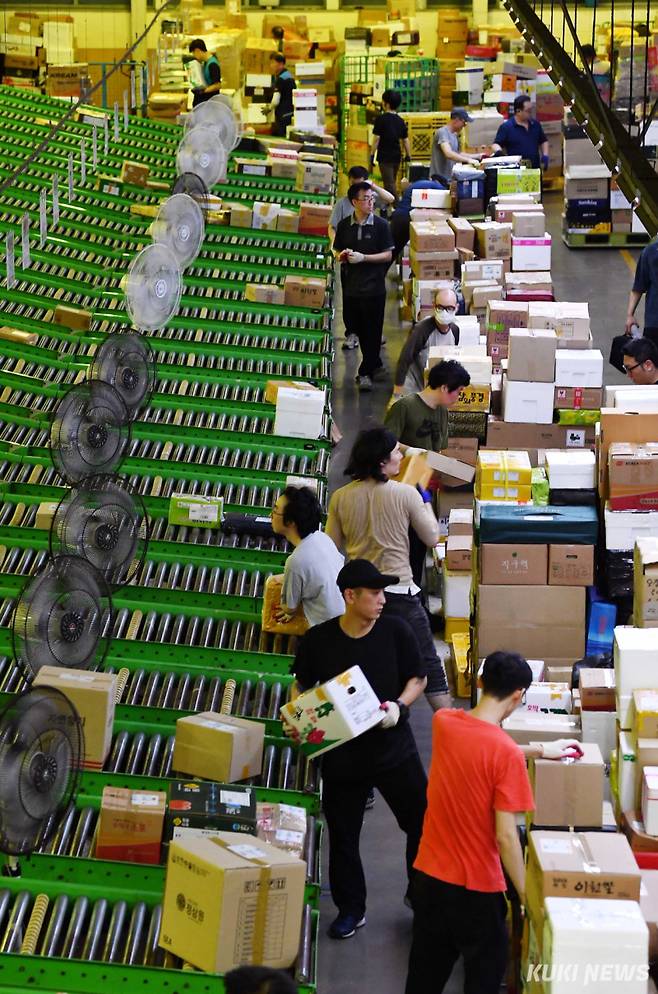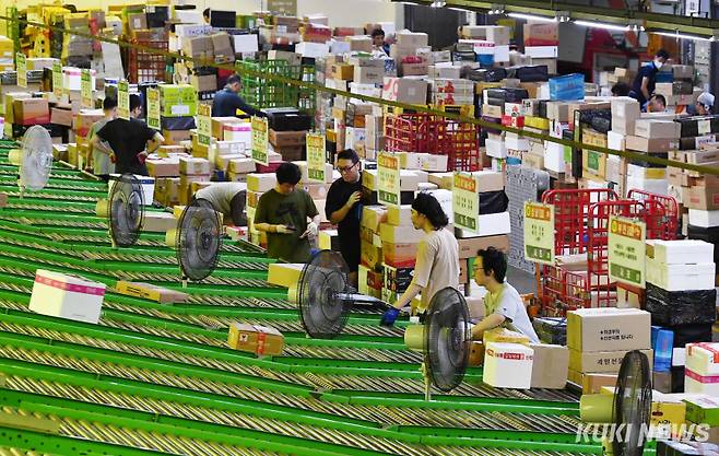 최대 명절 추석을 1주일 앞둔 10일 서울 광진구 동서울우편물류센터에서 추석비상근무에 들어간 직원들이 고객에게 전달될 소포와 택배물품을 분류하며 구슬땀을 흘리고 있다. 과학기술정보통신부 우정사업본부는 지난 2일부터 이달 20일까지 '추석 명절 우편물 특별소통기간'으로 정하고 안전하고 신속한 배달을 위해 비상근무체계에 돌입했다.