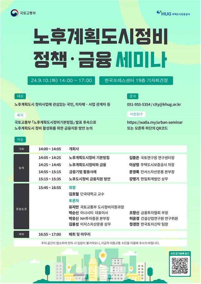 국토교통부는 주택도시보증공사(HUG) 주관으로 10일 오후 한국프레스센터에서 '노후계획도시정비 정책·금융 세미나'를 개최한다고 밝혔다.