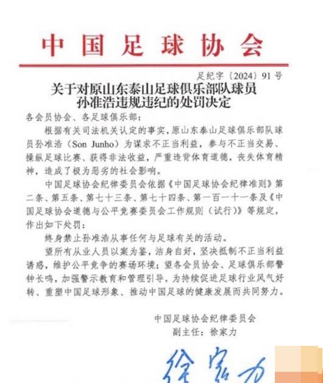 중국축구협회는 이에 맞춰 61명에 대한 징계안을 발표했다. 안타깝게도 손준호는 영구 제명 처분을 받았다. 중국축구협회는 '손준호가 부정적인 이익을 추구했고, 체육 정신을 손상했다. 중국축구협회의 준칙 등에 따라 축구와 관련된 행위를 금지시키는 영구 제명 처분을 내린다'고 했다. 손준호는 국가대표 선발은 물론, 아예 선수생활이 막힐 수도 있게 됐다.