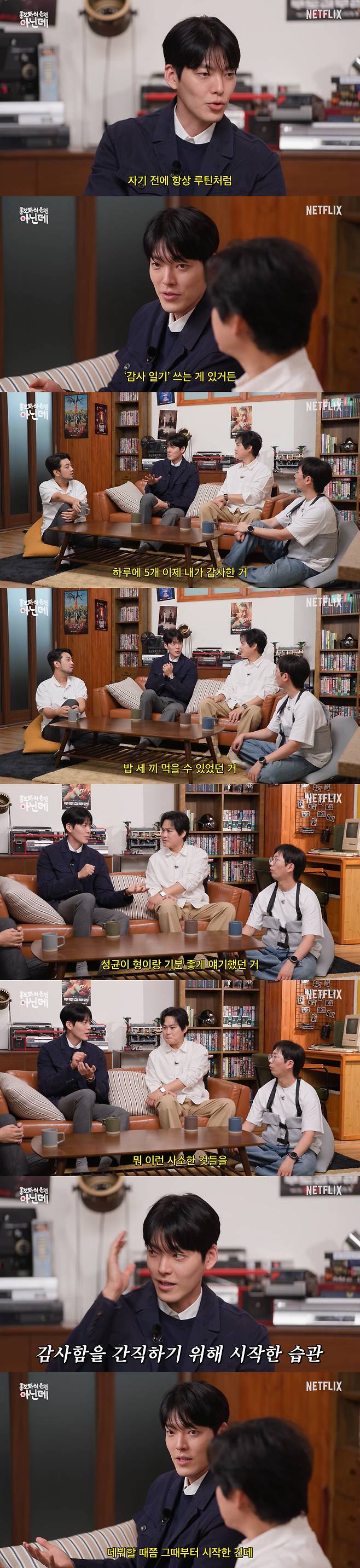 그러면서 김우빈은 "매일 매일 뭐 하는 거 있냐"라는 물음에 "자기 전에 항상 루틴처럼 '감사 일기'를 쓴다. 하루에 5개를 감사한 일을 쓴다"라고 밝혔다.