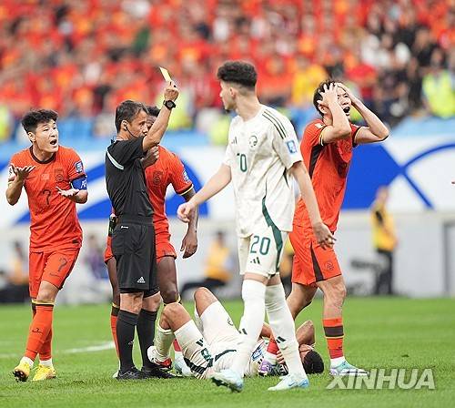 (240910) -- DALIAN, Sept. 10, 2024 (Xinhua) -- Li Yuanyi (R) of China is given a yellow card during the 2026 FIFA World Cup Asian Qualifiers match between China and Saudi Arabia in Dalian, northeast China's Liaoning Province, Sept. 10, 2024. (Xinhua/Li Gang)