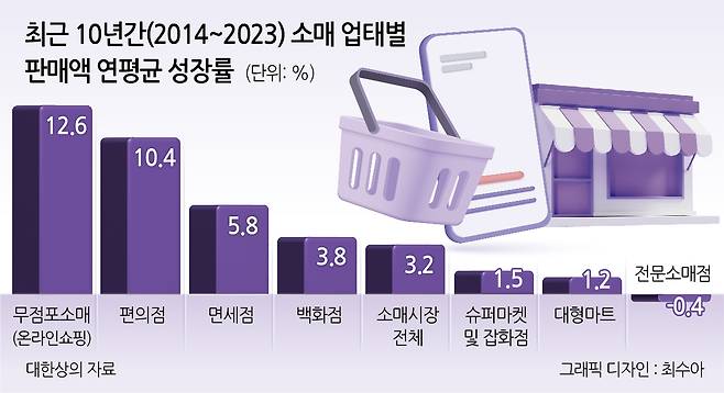 11일 대한상공회의소는 통계청 소매판매액 데이터를 바탕으로 지난 10년간(2014~2023) 소매시장 변화를 살펴본 결과, 무점포소매(온라인쇼핑, TV홈쇼핑 등 12.6%), 편의점(10.4%)이 소매시장 평균성장률(3.2%)을 크게 웃돌며 시장 성장을 주도한 것으로 분석됐다고 밝혔다. 반면, 슈퍼마켓(1.5%), 대형마트(1.2%), 전문소매점은 시장 평균성장률을 밑돌며 고전했다.