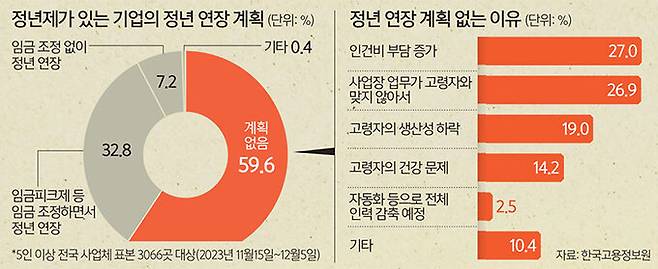 정년 연장 계획이 없다고 답한 기업에 그 이유를 묻자 ‘인건비 부담 증가’(27.0%)가 가장 많았고, 그 외에 ‘사업장 업무가 고령자와 맞지 않아서’(26.9%), ‘고령자의 생산성 하락’(19.0%) 등이 거론됐다.
