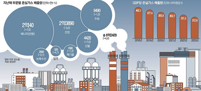10일 환경부는 지난해 온실가스 배출량 6억2420만t 중 에너지 부문이 2억40만t, 산업 부문이 2억3890만t으로 집계됐다고 밝혔다. 이는 2022년보다 각각 7.6%, 3.0% 감소한 수치다. 산업 부문은 2019년부터 에너지 부문을 넘어 온실가스를 가장 많이 배출하는 영역으로 꼽히고 있다.