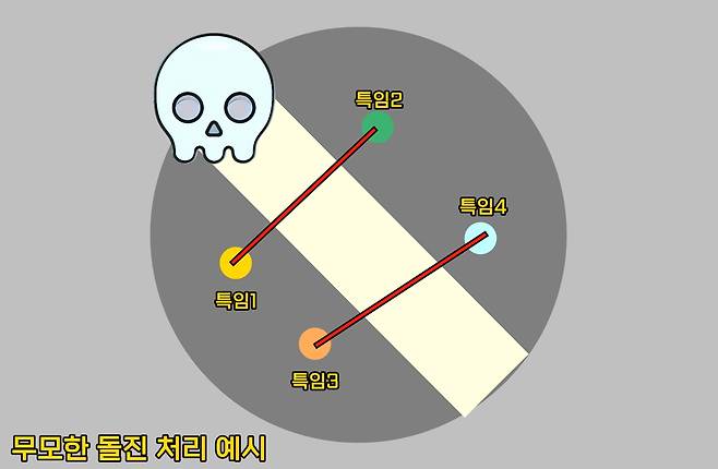 ② 징표로 연결된 대상자는 화살표로 연결 → 화살표 순서대로 돌진해 경로에 위치한 모든 공대원에게 피해