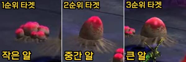 - 작은 알 쫄 : 최우선 타겟으로 무작위 공대원에게 주시대상을 걸고 추격하고, 추가 쫄 2마리를 소환하는 [감염] 디버프 부여 → 흩어지기 전에 CC 걸고 광딜로 처리