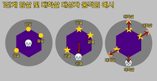 ■ 1단계 : 암살 - 균열 - 대학살 - 균열 - 대학살