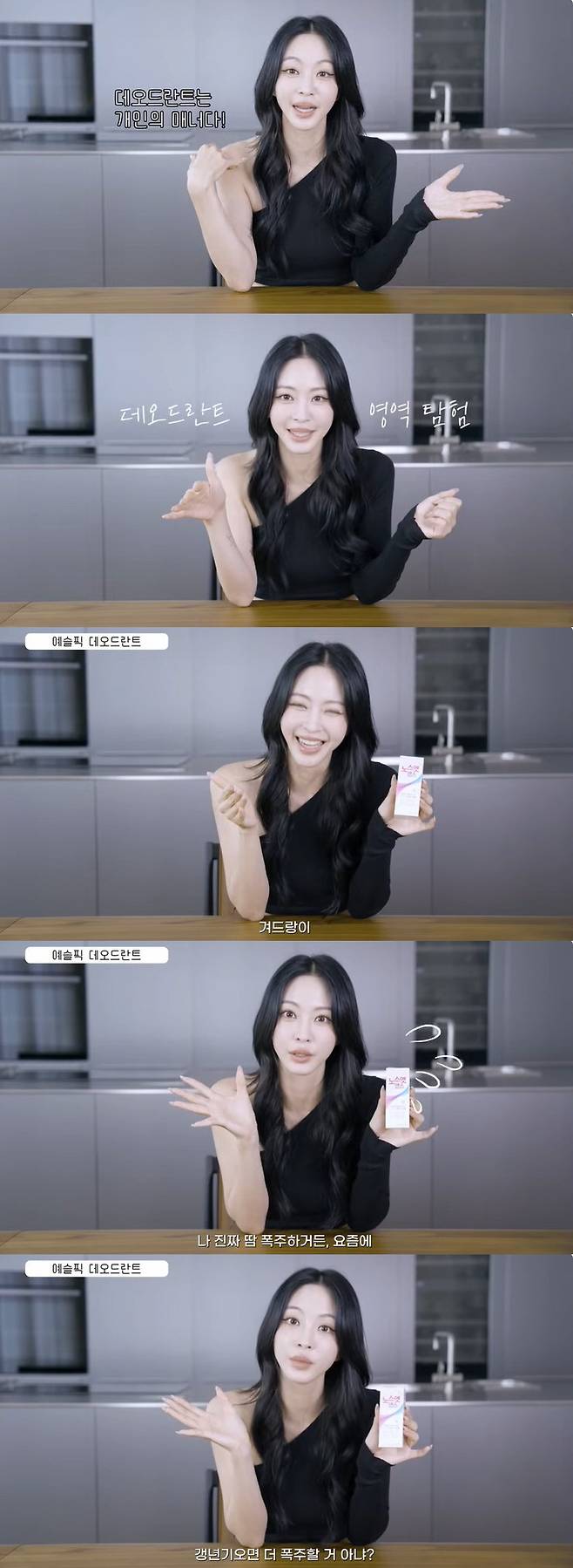 이어 핸드워시, 바디로션, 기초 케어 제품 등을 소개한 한예슬은 "내가 최근에 이쁜이들한테 소개시켜주고 싶다기 보다는 나누고 싶었던 것 중에는 새로운 영역이다. 나한테는. 데오드란트"라며 "사실 나는 그동안 데오드란트를 사용하지 않았다. 그렇게 땀이 많이 나는 스타일은 아니었는데 긴장하지도 않았는데 시도 때도 없이 땀이 날 때가 있더라"라고 토로했다.