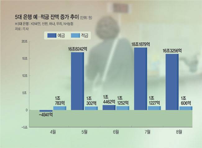 11일 금융권에 따르면 지난달에만 약 17조 원이 5대 은행의 예·적금으로 몰렸다. 8월 말 기준, KB국민·신한·하나·우리·NH농협은행 등 5개 은행의 정기예금 잔액은 925조6659억 원으로 전달보다 16조3256억 원 늘었다. 5월부터 4개월 연속 증가세다. 특히, 미 기준 금리 인하 논의가 본격화한 7·8월에 증가 폭이 컸다. 정기적금 잔액도 지난달 말 36조7917억 원으로 전달과 견줘 1조606억 원 늘었다. 4월부터 매월 1조 원 이상씩 불어나고 있다.