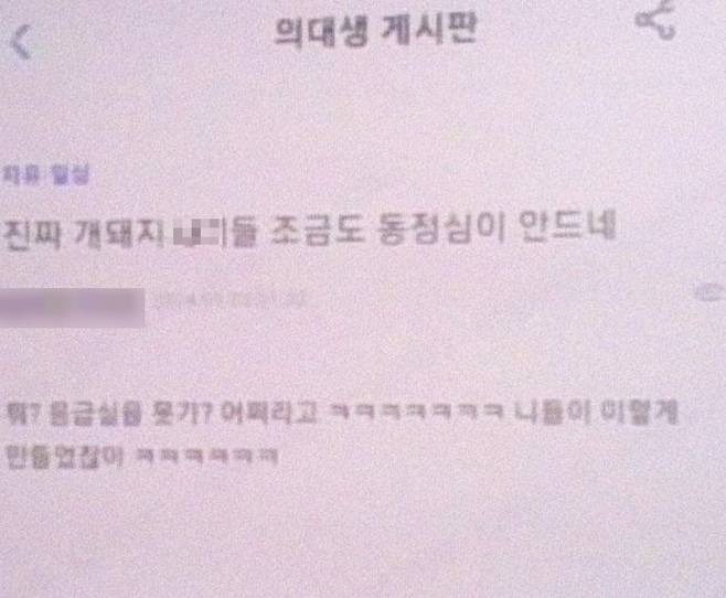 의사와 의대생들만 가입이 가능한 한 게시판에 정부의 의대 증원방침과 응급실 대란을 두고 '국민들이 더 죽어 나가야 한다'는 취지의 글들이 다수 올라와 충격을 주고 있다.
