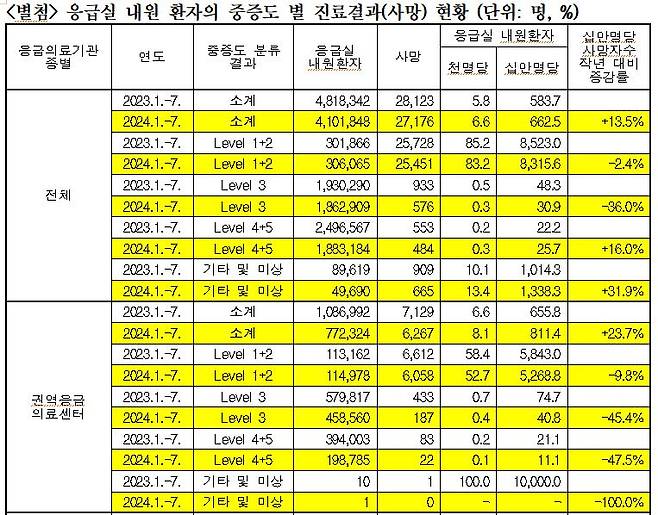 11일 국회 보건복지위원회 소속 김선민 조국혁신당 의원(비례대표)이 국립중앙의료원로부터 제출받은 '응급의료기관 종별 중증도 분류 결과별 응급실 진료결과'를 분석한 결과 올해 1월부터 7월까지 응급실을 찾은 환자 10만명당 사망자수는 662.5명이었다. 이는 작년 같은 기간(583.7명)에 비해 13.5% 증가한 수준이다.