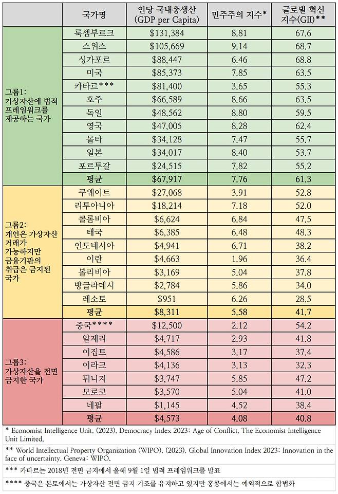 법적 프레임워크를 갖춘 그룹1 국가들의 평균 1인당 GDP는 6만7917 달러로, 가상자산을 전면 금지한 그룹3 국가들의 4619달러나 금융기관만 금지한 그룹2 국가들의 8311달러와 비교해 현저히 높다. 민주주의 지수에서도 그룹1 국가들은 평균 7.76점으로, 다른 두 그룹(4.08점, 5.58점)을 크게 상회한다. 글로벌 혁신 지수(GII)에서도 그룹1 국가들은 평균 61.26점으로, 다른 그룹들(40.79점, 41.72점)을 큰 격차로 앞서고 있다.