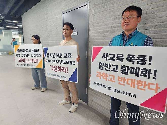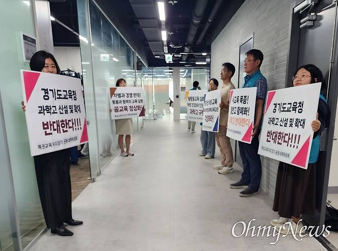 과학고 확대에 반대하는 전국교직원노동조합(전교조) 경기지부와 교육단체 회원들은 브리핑이 열린 교육청 4층 중회의실 복도에서 손팻말을 들고 조용한 시위를 벌였다. 이들의 손에 들린 손팻말에는 "사교육 폭증, 일반고 황폐화, 과학고 반대한다" 등의 글귀가 적혀 있었다.