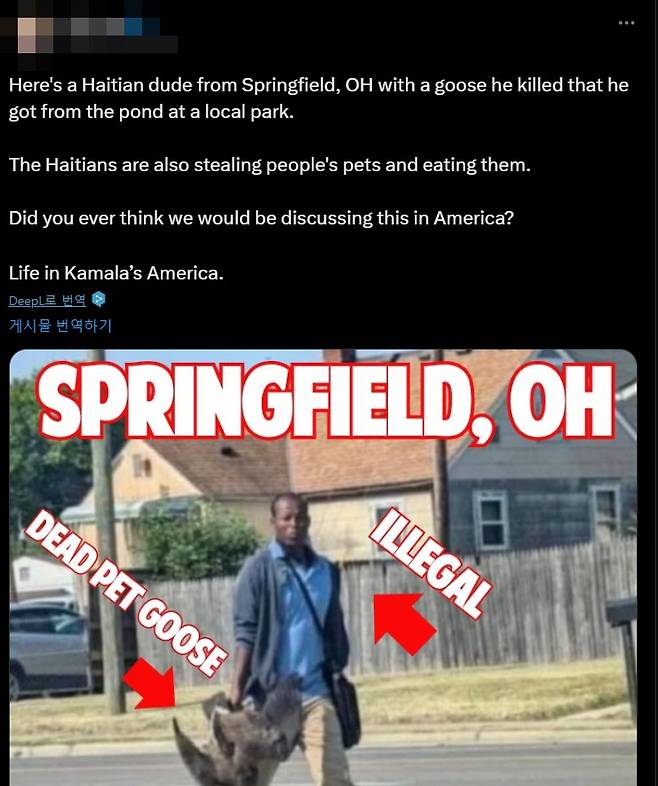 | ▲ 지난 9일 X(옛 트위터)에 ”오하이오주 스프링필드에 사는 한 아이티 남성이 지역 공원의 연못에서 잡은 거위를 들고 있다. 아이티 사람들은 사람들의 애완동물을 훔쳐서 먹기도 한다“고 주장하는 게시물과 사진이 올라왔으나, 스프링필드에서 동쪽으로 77km 떨어진 오하이오주 콜럼버스에서 지난 8월경 촬영된 사진이었다. |