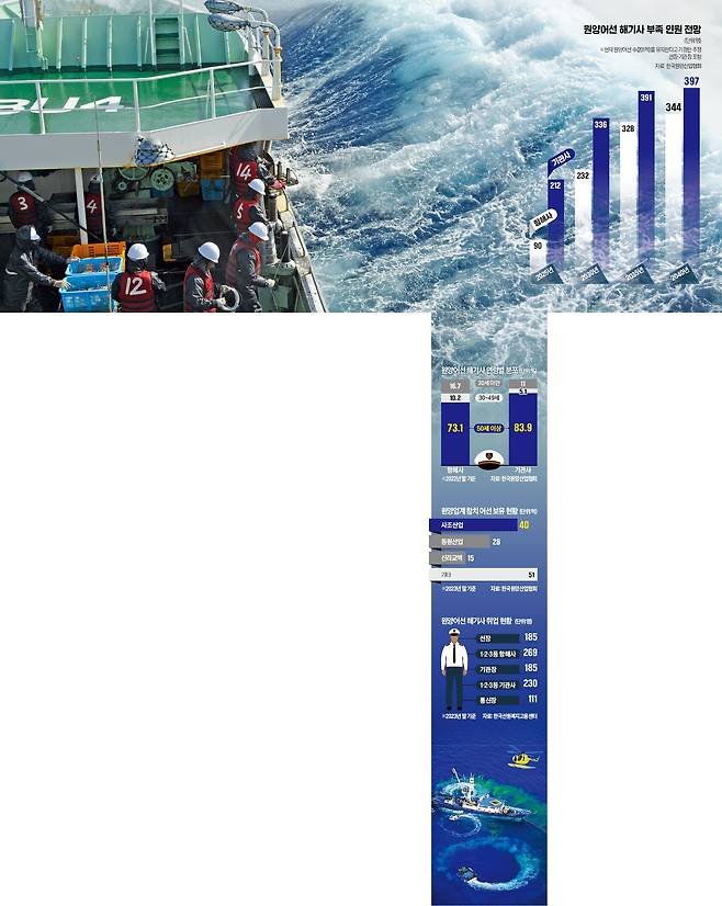 선박직원법은 선박 톤수(길이) 등에 따라 갑판부와 기관부에 승선해야 하는 해기사의 자격 급수와 인원을 정하고 있다. 2000t급 선망 어선의 최소 승선 인원은 선장을 포함해 항해사 네 명과 기관사 네 명이다. 원양산업협회에 따르면 내년에 국내 원양어선에 승선해야 하는 해기사는 961명으로 추산됐다. 그러나 퇴직과 신규 임용 등을 감안한 해기사는 659명에 불과해 302명이 부족할 것으로 분석됐다. 원양산업협회 관계자는 “신규 인력이 충원되지 않으면 퇴직해야 할 60, 70대 고령 해기사가 조업을 이어갈 수밖에 없다”고 했다.