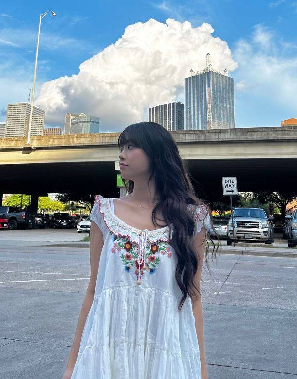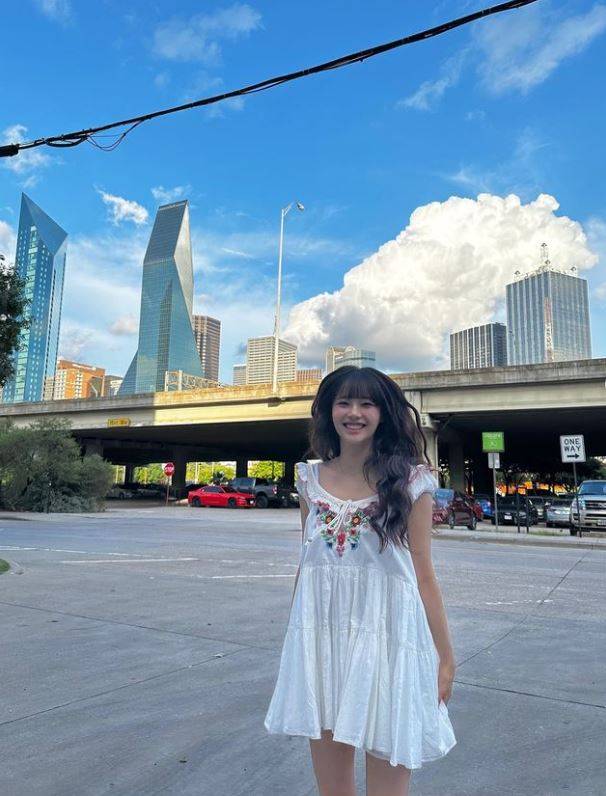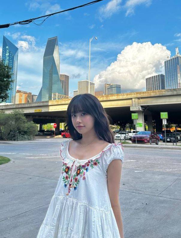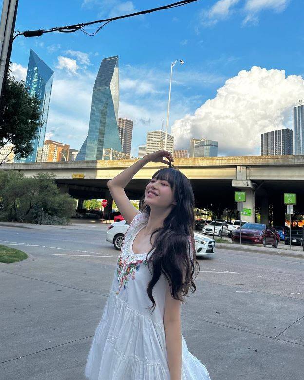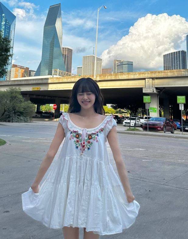 사진 속 츄는 흰색 바탕에 꽃무늬가 들어간 원피스를 입고 포즈를 취했다.