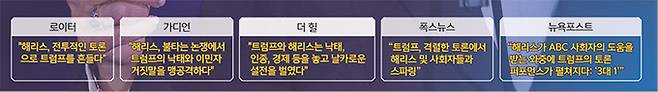 트럼프 전 대통령에 우호적인 폭스뉴스는 토론에 대해 ‘트럼프, 해리스 및 사회자들과 스파링’이라고 평가했다. 토론을 진행한 ABC방송 사회자들이 트럼프 전 대통령에게 불리하게 진행했다는 지적이다.