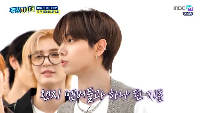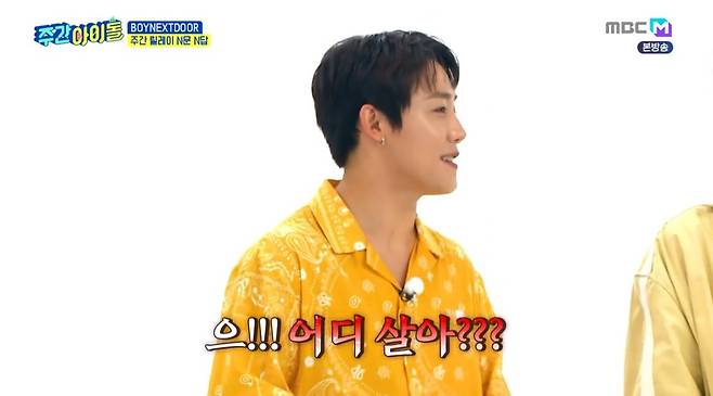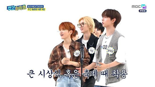 11일 저녁 MBC M '주간 아이돌'에서는 보이 그룹 '보이넥스트도어(BOYNEXTDOOR)' 멤버들(성호·리우·명재현·태산·이한·운학)이 출연해 숨겨둔 예능감을 뽐냈다.