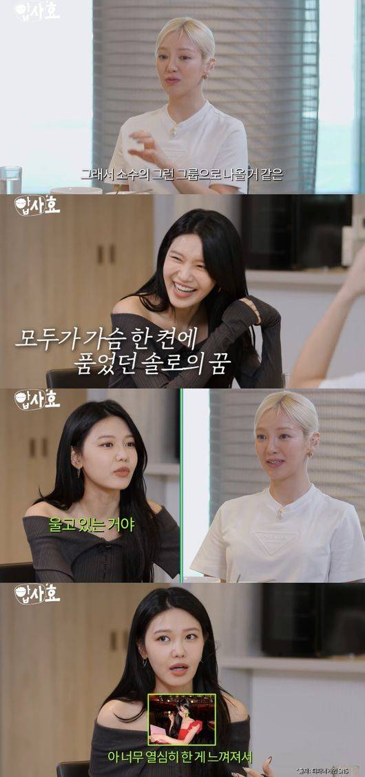 무엇보다 솔로 데뷔를 앞두고 있다는 수영은 “티파니한테 솔로곡을 보냈는데 영상 통화가 왔다. 파니가 울고 있더라. 펑펑 울고 있더라. ‘왜 울어’ 그랬더니 너무 열심히 한 게 느껴져서 눈물이 났다고 하더라”라며 눈시울을 붉혔다. 이를 들은 효연도 함께 눈물을 보였고, 수영은 “우리 서로가 서로의 성장 시기를 같이 공유하고 같이 아니까 멤버가 딱 다른 거 하면 ‘이 친구는 진짜 계속 발전하는 구나’ 느껴지니까”라고 말해 뭉클함을 자아냈다.