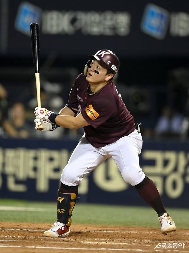 11일 서울 잠실야구장에서 ‘2024 신한은행 SOL뱅크 KBO리그’ 키움 히어로즈와 LG 트윈스 경기가 열렸다. 7회초 무사 1,2루 키움 최주환이 동점을 만드는 좌전 안타를 치고 있다. 잠실|김종원 기자 won@donga.com