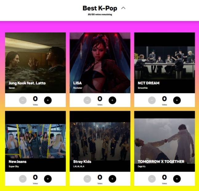 ‘베스트 K-팝’ 후보에 오른 여섯 팀은 뉴진스, BTS 정국, NCT 드림, 투모로우바이투게더, 블랙핑크 리사, 스트레이 키즈다. 이들 중엔 ‘슈퍼 샤이’로 이름을 올린 뉴진스와 ‘세븐’으로 노미네이트 된 BTS 정국의 수상 가능성이 높게 점쳐지고 있다.