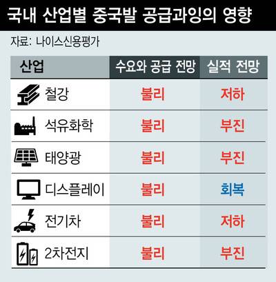 국내 신용평가회사인 나이스신용평가는 11일 ‘중국 공급 과잉 심화와 신용 위험’ 세미나를 열어 “중국의 공급 과잉이 지속되며 국내 주요 사업 환경도 쉽지 않을 것으로 전망된다”고 짚었다. 구체적으로 철강·석유화학·태양광·디스플레이·전기차·2차전지 등 6개 주요 업종의 수요와 공급 여건이 모두 국내 기업에 불리한 것으로 전망됐다. 중국산을 포함한 제품 과잉 공급이 수요를 큰 폭으로 넘어서며 가격 하락 등 기업 실적에 악영향을 미칠 것이란 얘기다. 특정 요인이 국내 제조업 전반에 충격을 가하리란 우려가 제기되는 건 이례적이다.