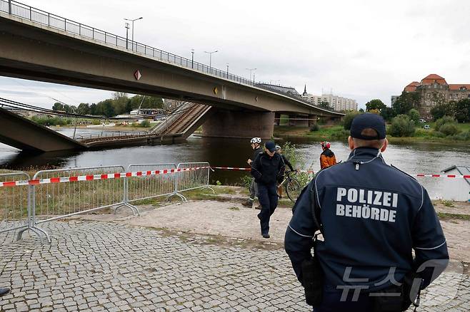 (드레스덴 AFP=뉴스1) 우동명 기자 = 11일 (현지시간) 독일 드레스덴에 있는 엘베 강의 카롤라 다리 100m 구간이 한밤 중에 폭삭 무너진 현장을 경찰이 통제하고 있다. 2024.09.12