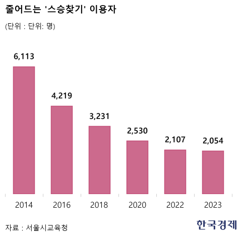 12일 서울교육청에 따르면 작년 접수된 스승찾기 서비스 이용자 수는 2054명이었다. 서비스를 개시한 2014년 6113명이었던 이용자 수가 10년 만에 66.4%가 줄었다. 2020년 이후에는 매년 2000명 대에 머무르고 있다.