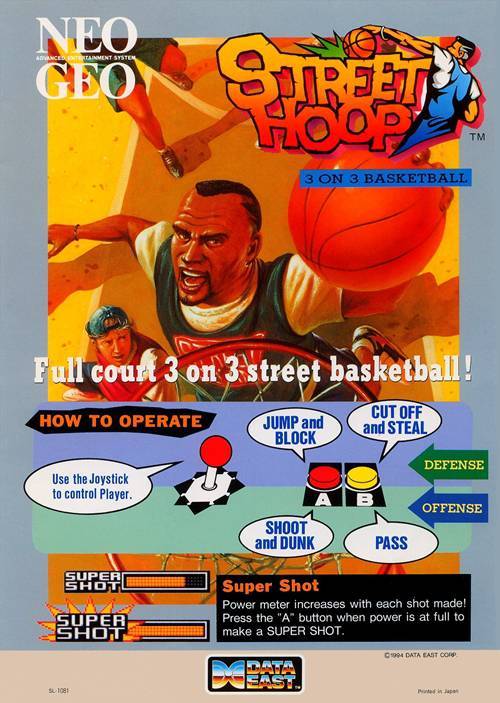 검떠: 데이터 이스트의 대표 농구 게임 '스트리트 후프'!! 네오지오 기판을 활용했기 때문에 상대적으로 저렴해서 국내 오락실에도 많이 보급되었었죠. 호쾌한 필살기와 아케이드성으로 많은 인기를 얻은 농구 게임이죠. 자세한 설명은 덩크 드림 95 버전에서 마저 하겠습니다.