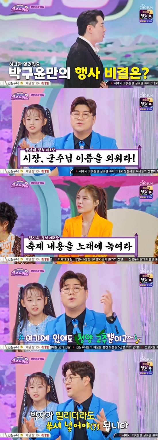 12일 방송된 TV조선 '미스쓰리랑'에서는 '행사의 왕' 특집을 맞아 조항조, 조혜련, 박구윤이 게스트로 출연했다.
