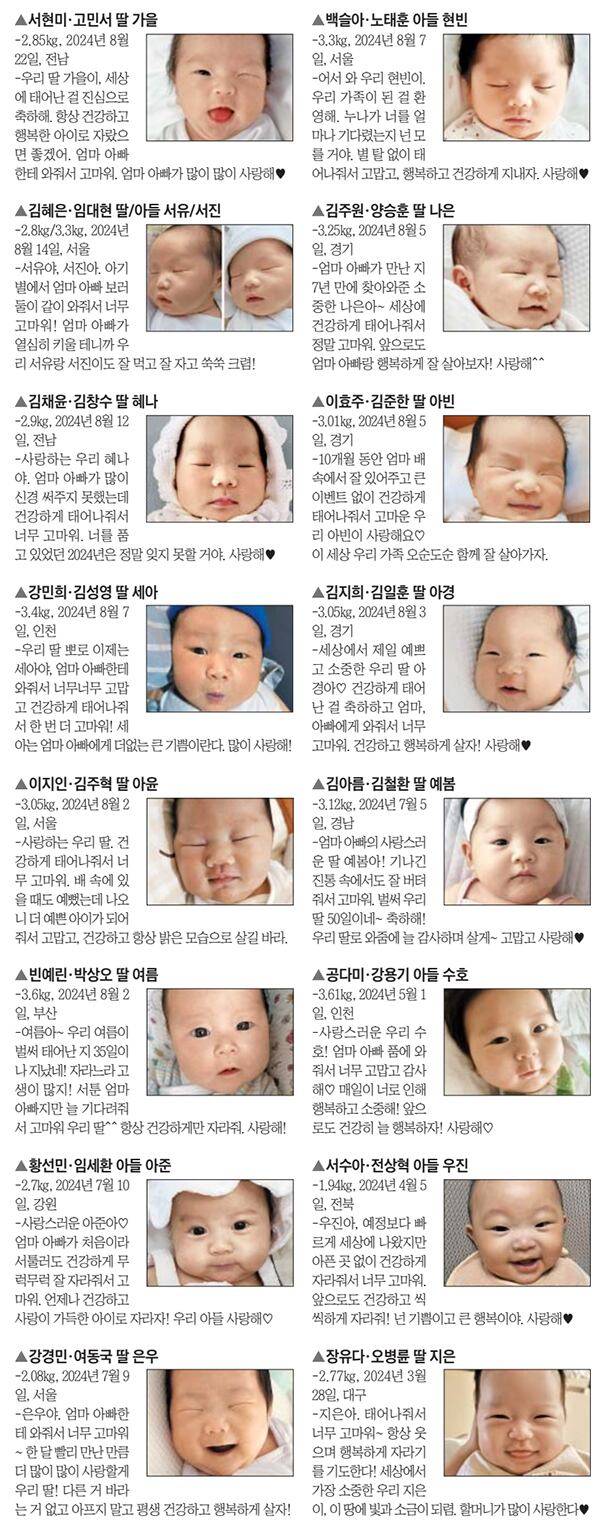 온 가족에게 기쁨을 안겨 준 아기의 탄생을 알려주세요. 홈페이지 주소 입력창에 아가야안녕.com이라고 입력하면 됩니다. 매일유업 육아 정보 사이트 매일아이(maeili.com)를 통해서도 접속할 수 있습니다. 추첨을 통해 출산 소식과 사진이 지면에 실린 가족에게는 ①케이크 구매권 ②엄마와 아기 영양을 챙겨줄 매일유업 ‘탄생 축하 선물’ ③출산 소식을 생일 날짜 본지 1면에 담은 PDF 파일 ④조선일보 1개월 무료 구독권을 드립니다. 당첨자 중 한 가족을 선정하여 해당 지면을 고급 프레임에 담아 제공하는 ‘조선일보 리프린트’도 제작해 드립니다. 홈페이지에서는 맘스 앱솔루트 첫 구매 52% 할인 혜택을 드리고 있습니다.