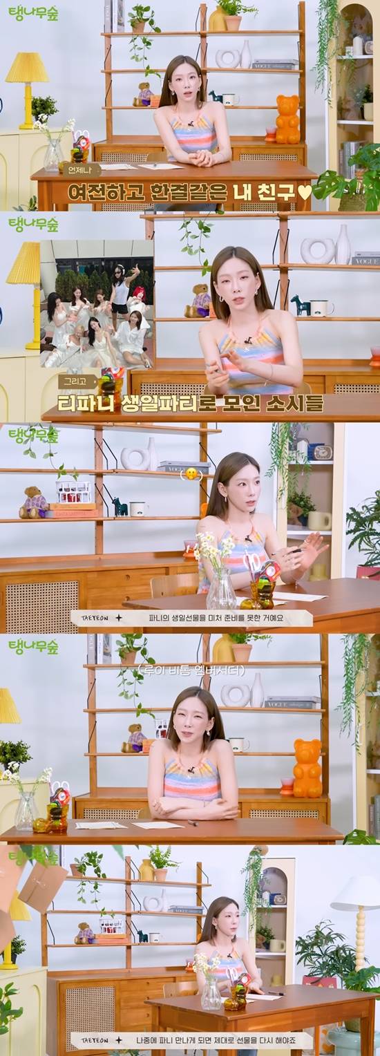 그러면서 티파니에게 파우치를 선물로 준 것에 대해 "소녀시대 17주년 기념 겸 티파니 생일 겸 자리였는데 17주년 기념 자리인 줄 알고 파니의 생일선물을 미처 준비를 못한 거다. 순간 순발력으로 LV(루이비통) 걸로서 (파우치를 줬다)"고 고백했다.