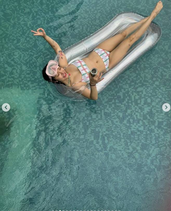 13일 지민은 자신의 SNS에 "가족여행"이라고 적고 비키니 입은 모습을 공개했다.