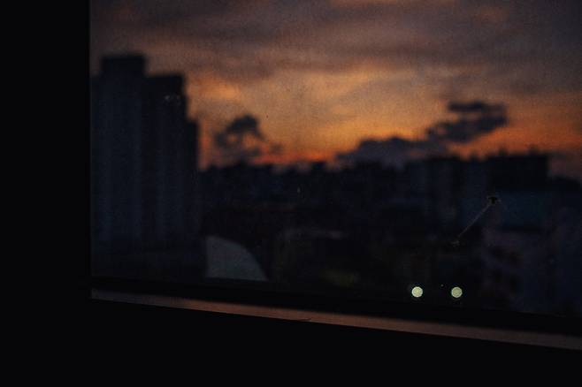 # 구름에 반사된 붉은 노을빛이 창밖에 펼쳐집니다. 하지만 사진의 초점은 창밖이 아닌 창틀에 있습니다. 찬란한 노을빛을 보고 싶지만, 저 스스로 반강제적으로 창틀로 초점을 돌렸습니다.