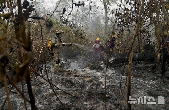 [리오 블랑코=AP/뉴시스] 12일(현지시각) 볼리비아 리오 블랑코 외곽 치키타니아 숲에서 의용 소방관들이 산불을 진압하고 있다. 볼리비아에 수개월째 산불이 이어지면서 현지 당국은 지난 7일 비상사태를 선포하고 국제사회의 지원을 요청했다. 2024.09.13.
