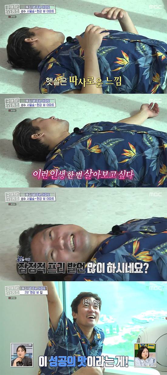 이를 오감으로 느끼고 싶은 김대호는 대리석 바닥에 벌러덩 드러누웠다. 그는 "바닥은 대리석이라 선선한데 창으로 따스한 햇빛이 들어온다"면서 "이런 인생 한번 살아보고 싶다"는 속마음을 밝힌다.