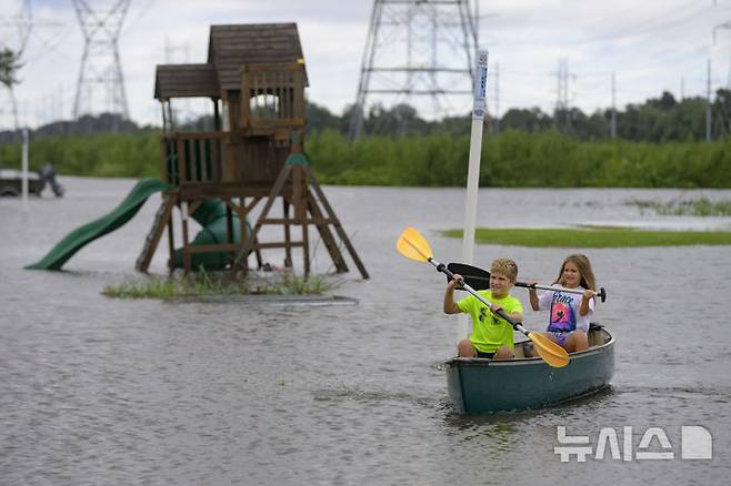 [먼츠=AP/뉴시스] 12일(현지시각) 미 루이지애나주 먼츠에서 에이버리(10)와 그레이스(7) 남매가 허리케인 프랜신 여파로 침수된 놀이터에서 보트 놀이를 하고 있다. 2024.09.13.