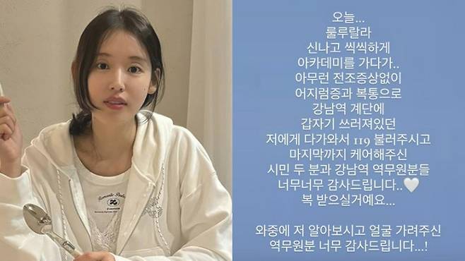 박환희는 "오늘 룰루랄라 신나고 씩씩하게 아카데미를 가다가, 아무런 전조증상 없이 어지럼증과 복통으로 강남역 계단에 갑자기 쓰러져있던 저에게 다가와서 119 불러주시고, 마지막까지 케어해주신 시민 두 분과 강남역 역무원분들 너무너무 감사드립니다. 복 받으실 거예요"라고 고마움을 드러냈다.