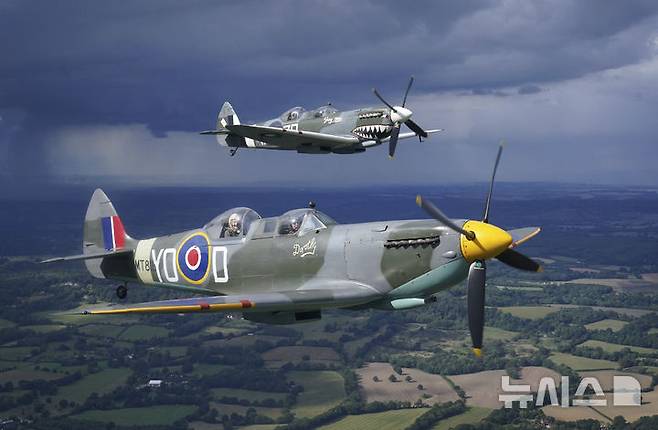 [웨스터햄=AP/뉴시스] 제2차 세계대전 참전용사 도로시아 배런(99, 앞)과 퀴니 홀(100)이 12일(현지시각) 영국 켄트주 웨스터햄에서 홀의 100번째 생일을 맞아 두 대의 스핏파이어로 기념 비행을 하고 있다. 두 사람은 두 명의 조종사가 각각 조종하는 비행기 뒷자리에 탑승해 기념 비행을 마쳤다. 2024.09.13.