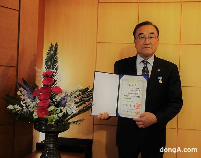 | 2016년 정부로부터 봉사활동으로 표창장을 받은 김만장 회장. 최재호 기자 cjh1225@donga.com |